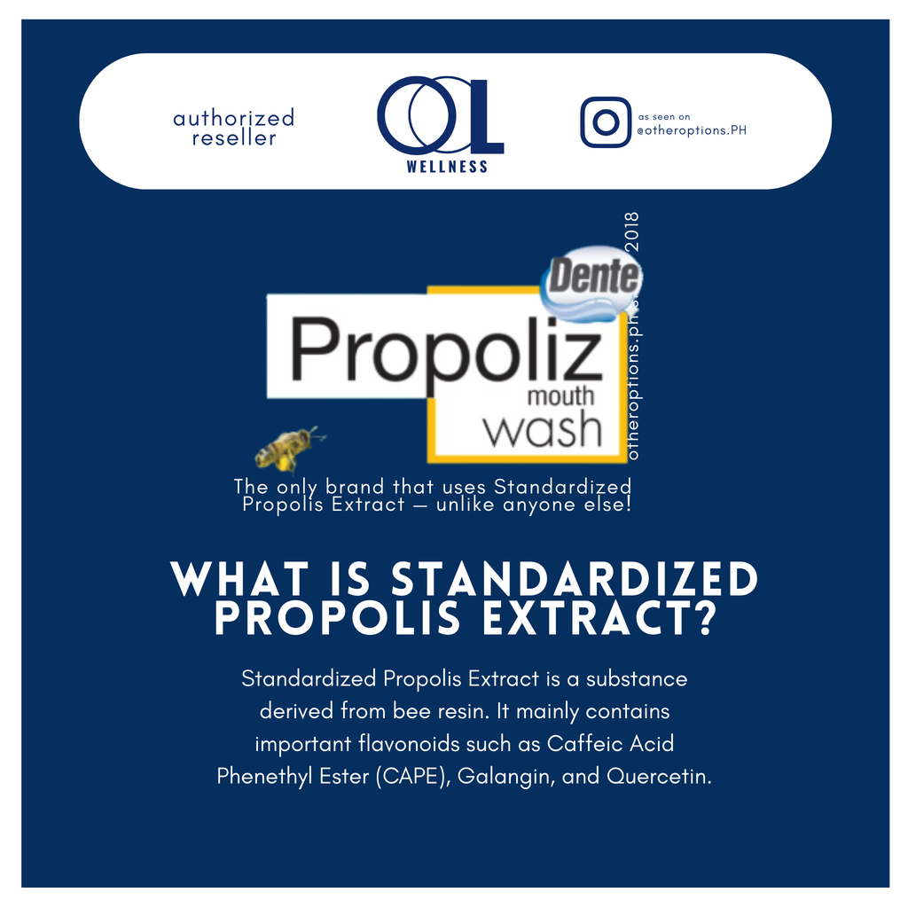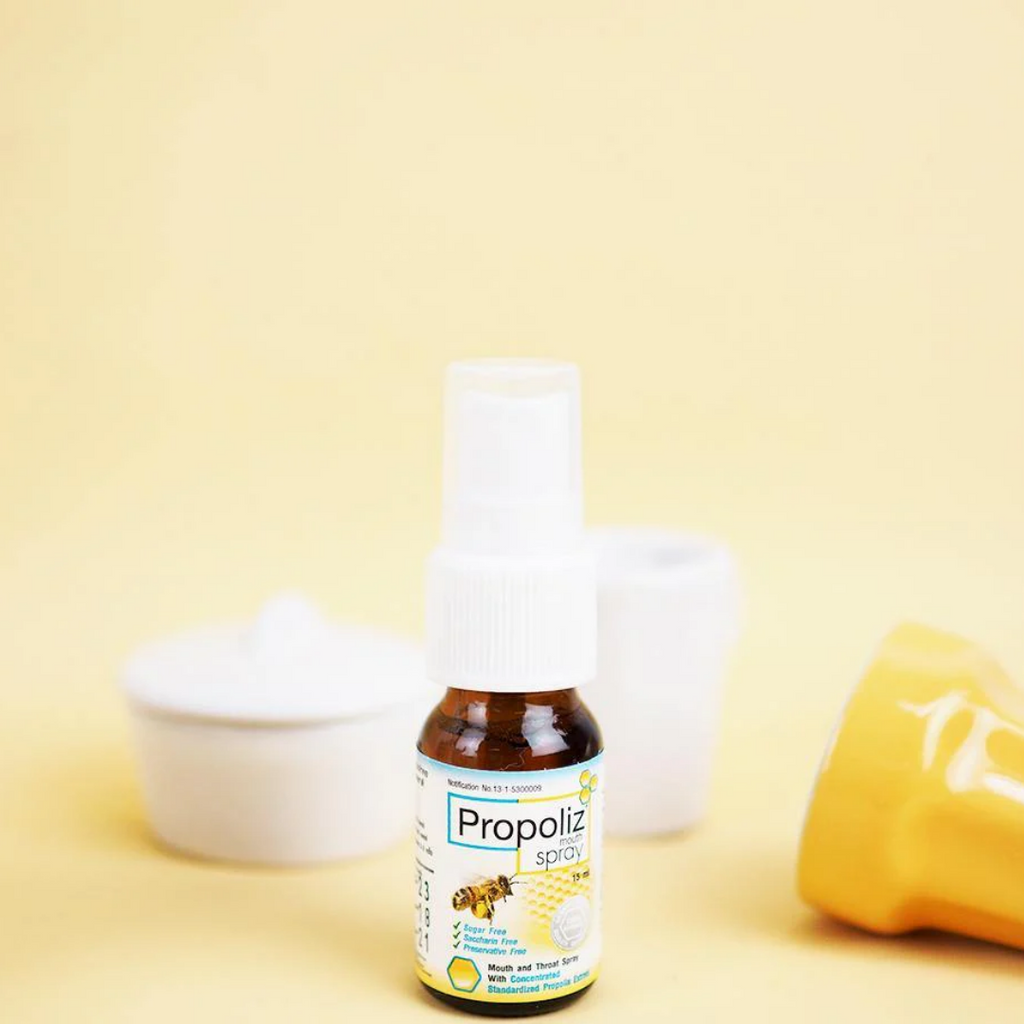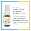 - Propolis is a bee waste product that contains flavonoids and essential oils, which provide the spray an anti-inflammatory effect.