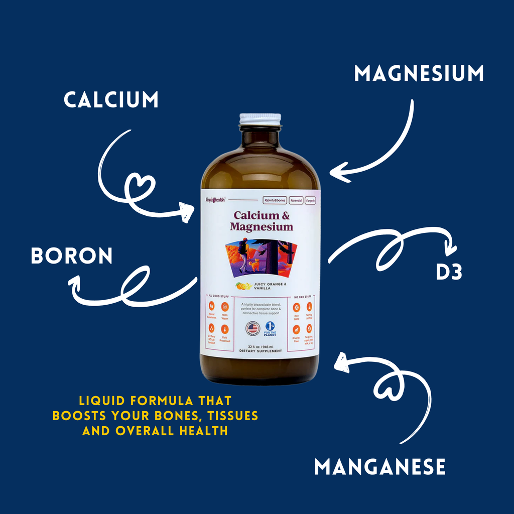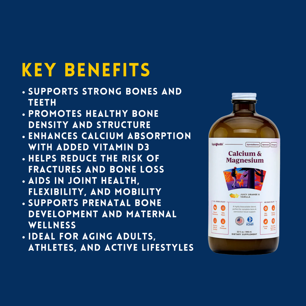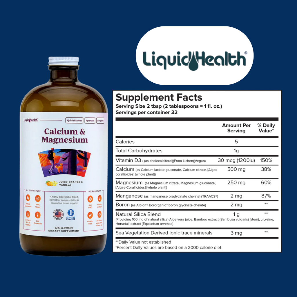 Strengthen your bones and support overall wellness with Liquid Health’s Liquid Calcium & Magnesium Supplement—a premium, fast-absorbing formula crafted for maximum effectiveness. This advanced blend combines calcium, magnesium, vitamin D3, boron, manganese, and a natural silica blend to deliver essential nutrients that promote bone density, joint health, and long-term skeletal strength.