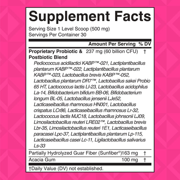 - With a big 23-strain blend of probiotic and postbiotic microbes, you’ll be getting 60 billion CFU with each serving with the bonus of SunFiber™ as a prebiotic, or food for those healthy gut bugs.