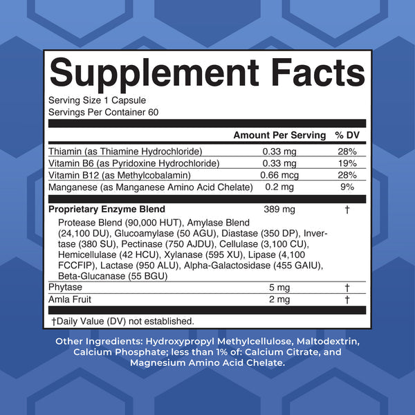 - This extra strength blend of enzymes is formulated with enzymes that support the digestion of proteins, carbohydrates, fiber, fat, and lactose.